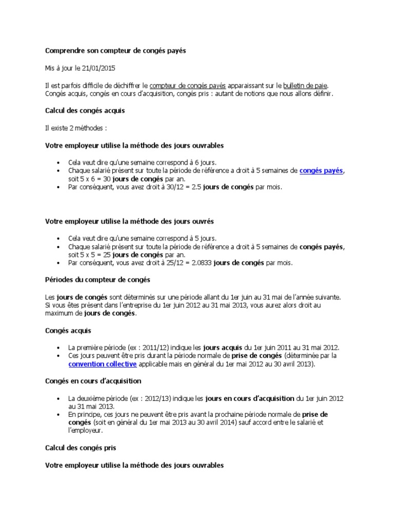 Déterminer le nombre de jours (fériés), le nombre de jours ouvrés entre deux dates données. Que le salarié travaille à temps plein ou à temps partiel, il acquiert 2,5 jours ouvrables: Le nombre de jours acquis peut dépendre des règles fixées par le code du travail ou par la convention collective.